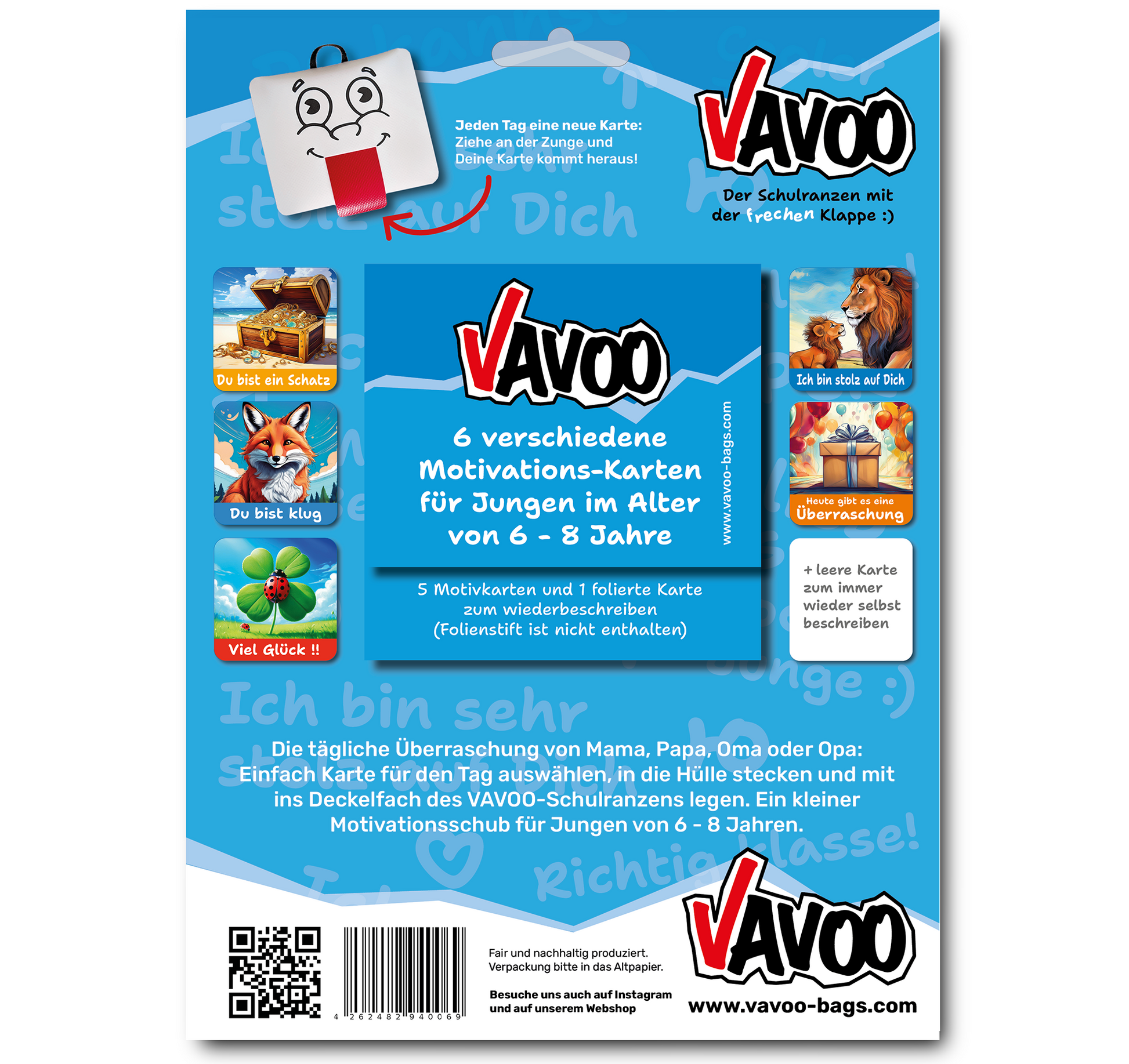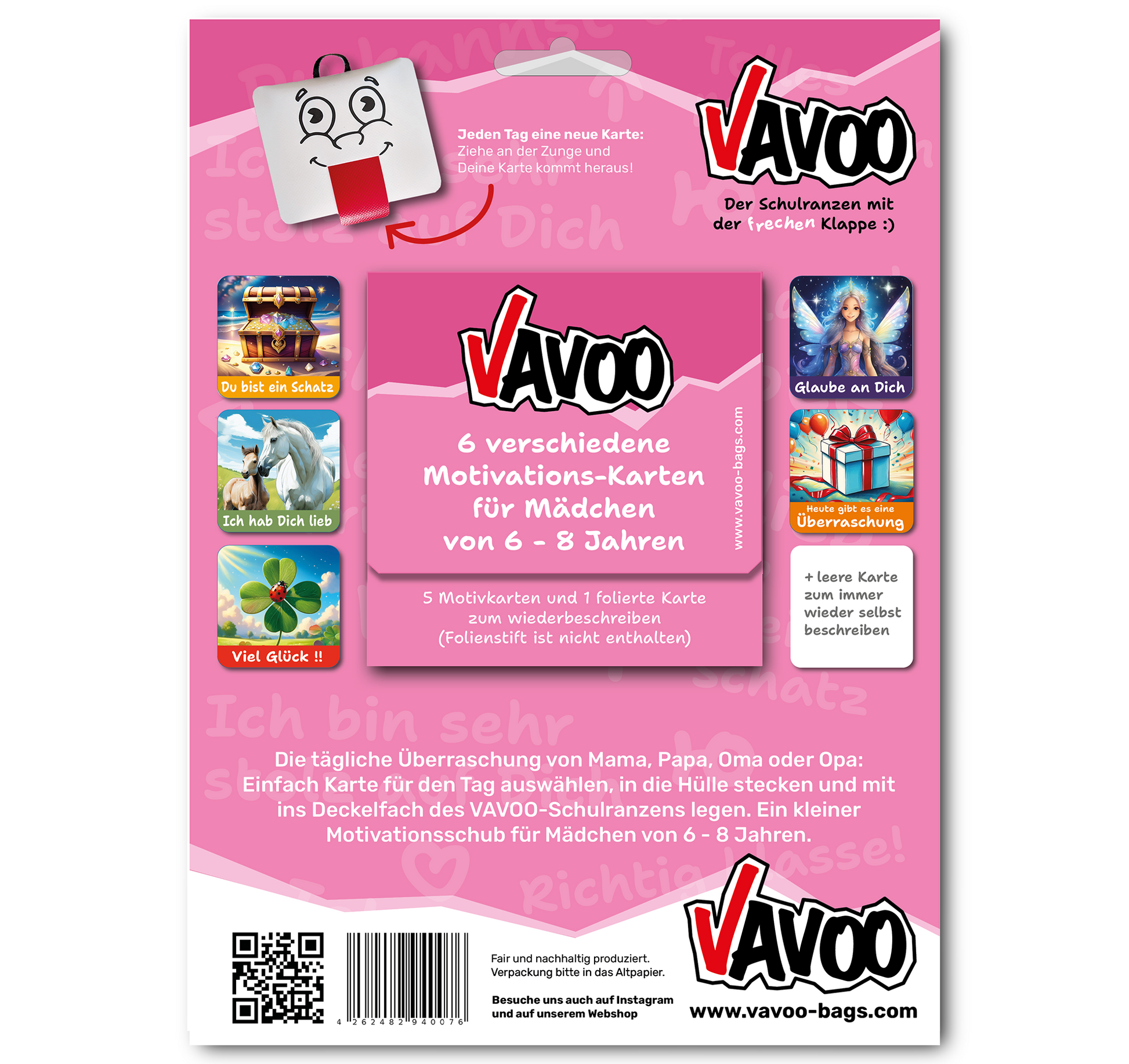 Zieh an der Zunge: Die „freche Klappe“ überrascht Mädchen und Jungen jeden Tag neu mit einer liebevollen oder motivierenden Botschaft, die über die Taschen-Zunge herausgezogen wird. Die Motivationskarte kann täglich neu von Mama, Papa, Oma oder Opa in die Zungentasche geschoben und im Deckelfach „versteckt“ werden. Diese kleine Streicheleinheit für die Kinderseele ist ein motivierender Begleiter für den Schulalltag. Die Karten sind für Mädchen und Jungen mit unterschiedlichen Motiven bedruckt. Eine Blanco-Karte kann darüber hinaus mit eigenen Botschaften individuell beschrieben oder bemalt werden (bitte dazu einen wieder abwischbaren Folienstift verwenden).