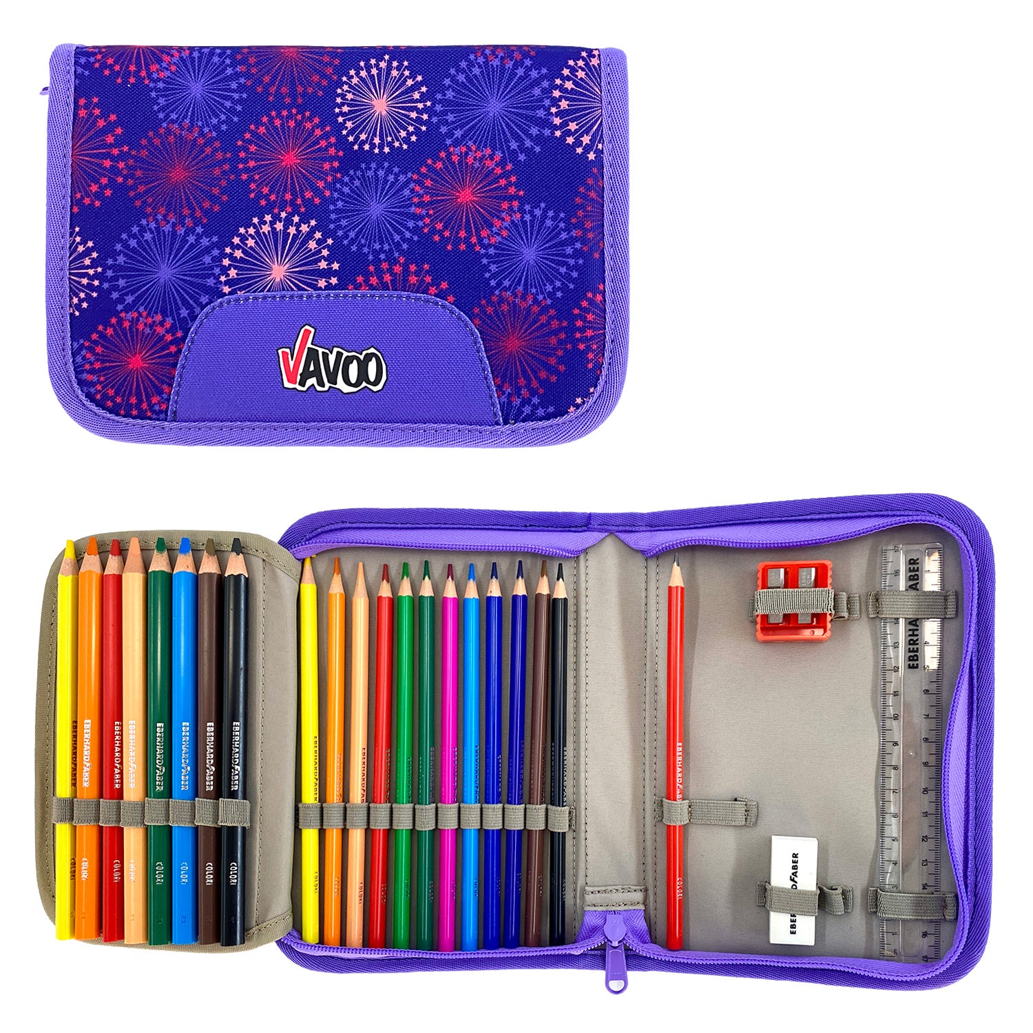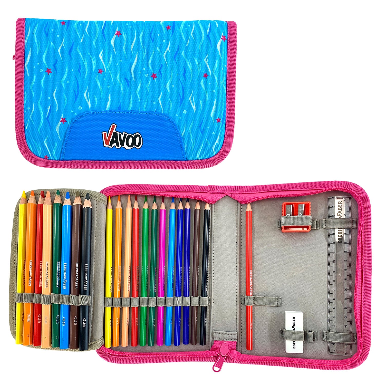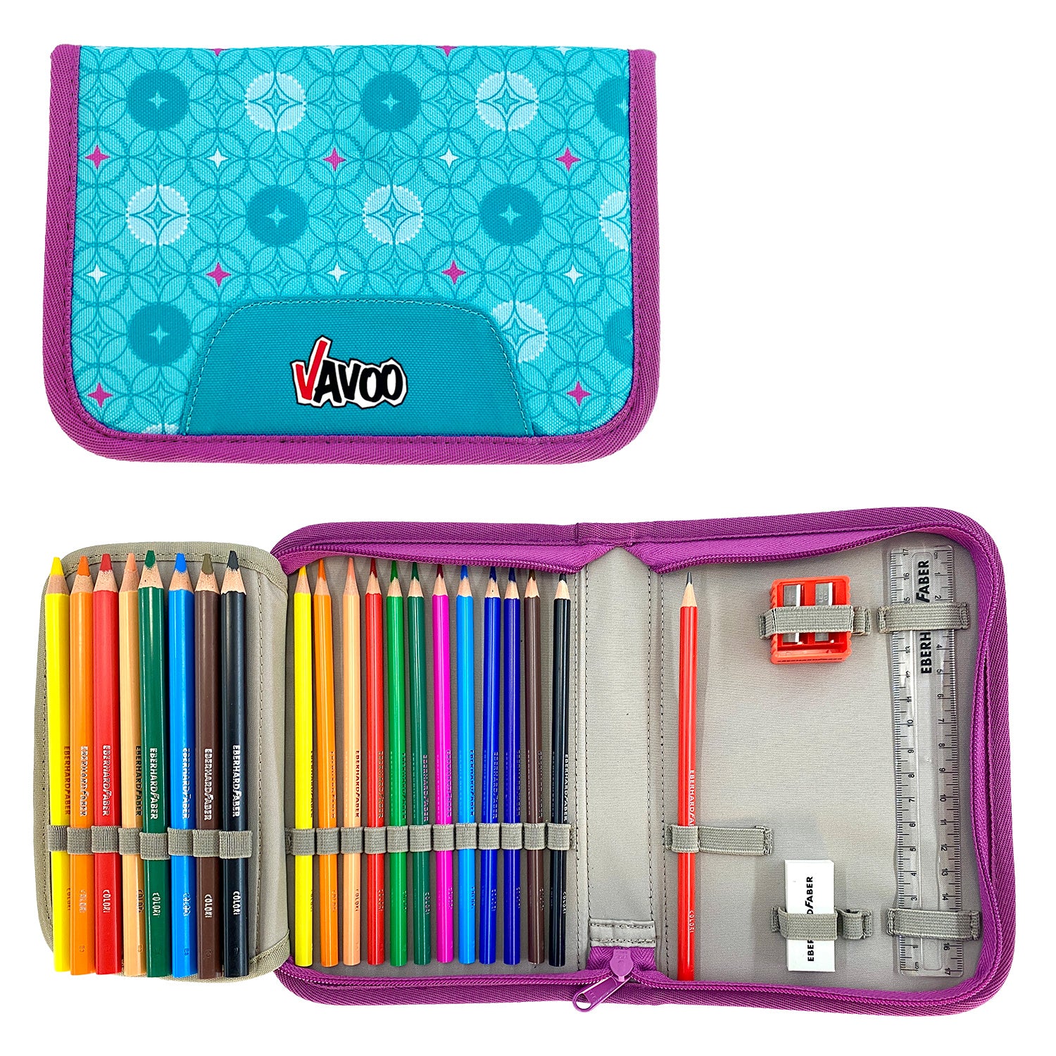 | Federmäppchen | Eberhart Faber: 12 Buntstifte (3 mm), 8 Farbstifte (5 mm), 1 Bleistift, 17cm Lineal, Radierer PVC Frei, Aluminium-Doppelspitzer mit Behälter |