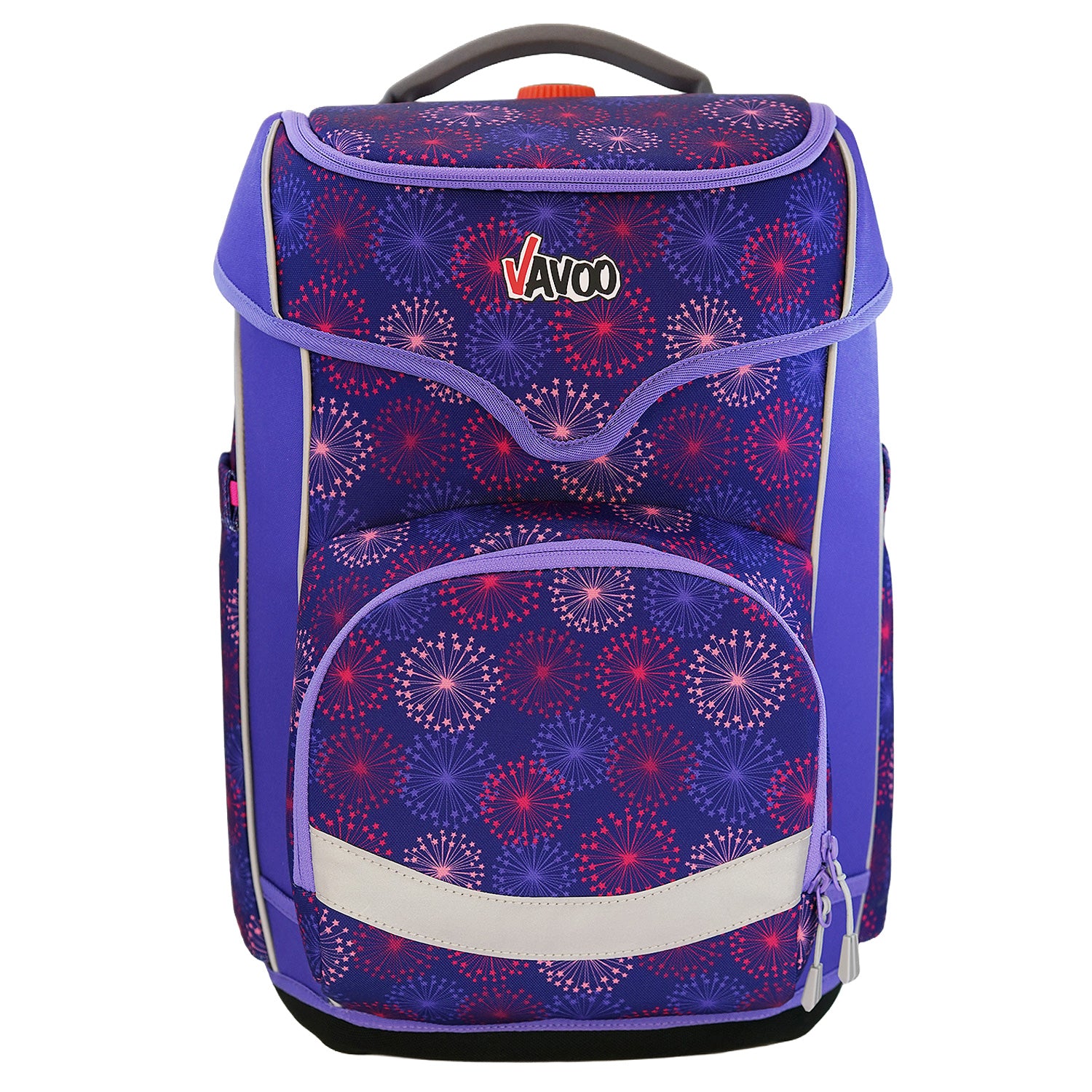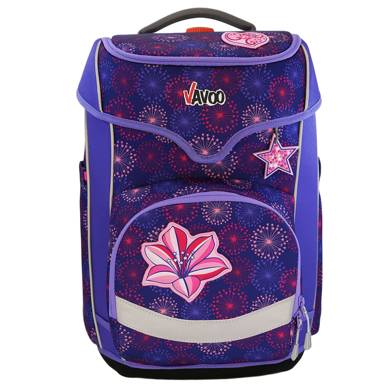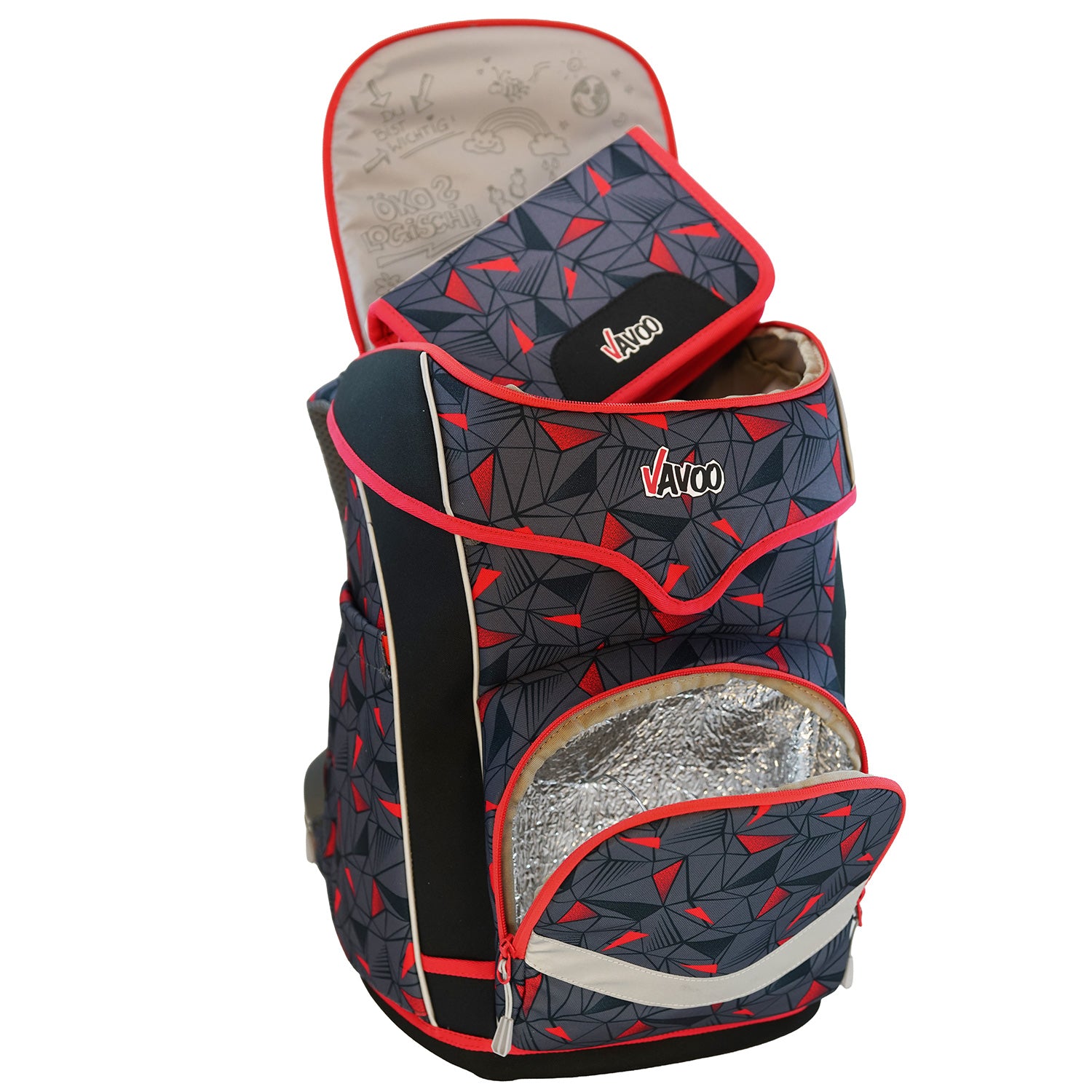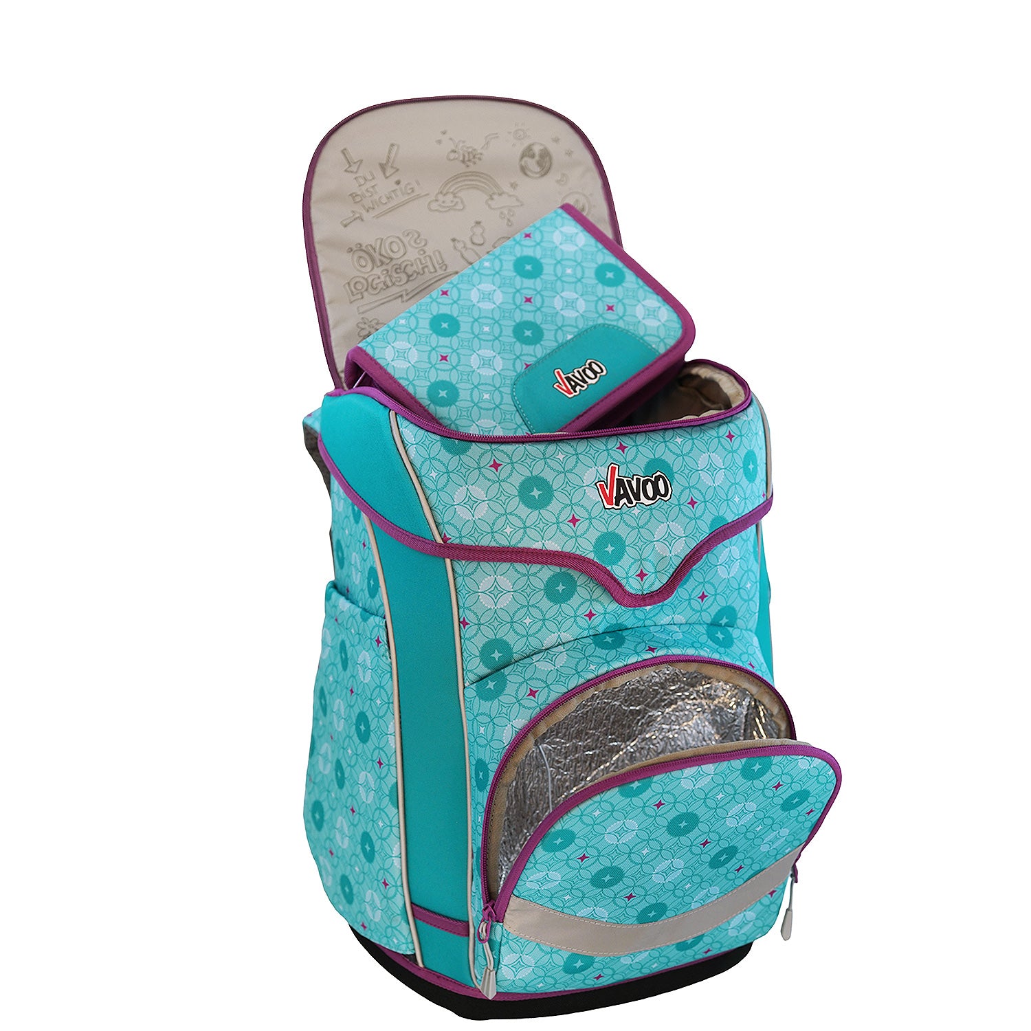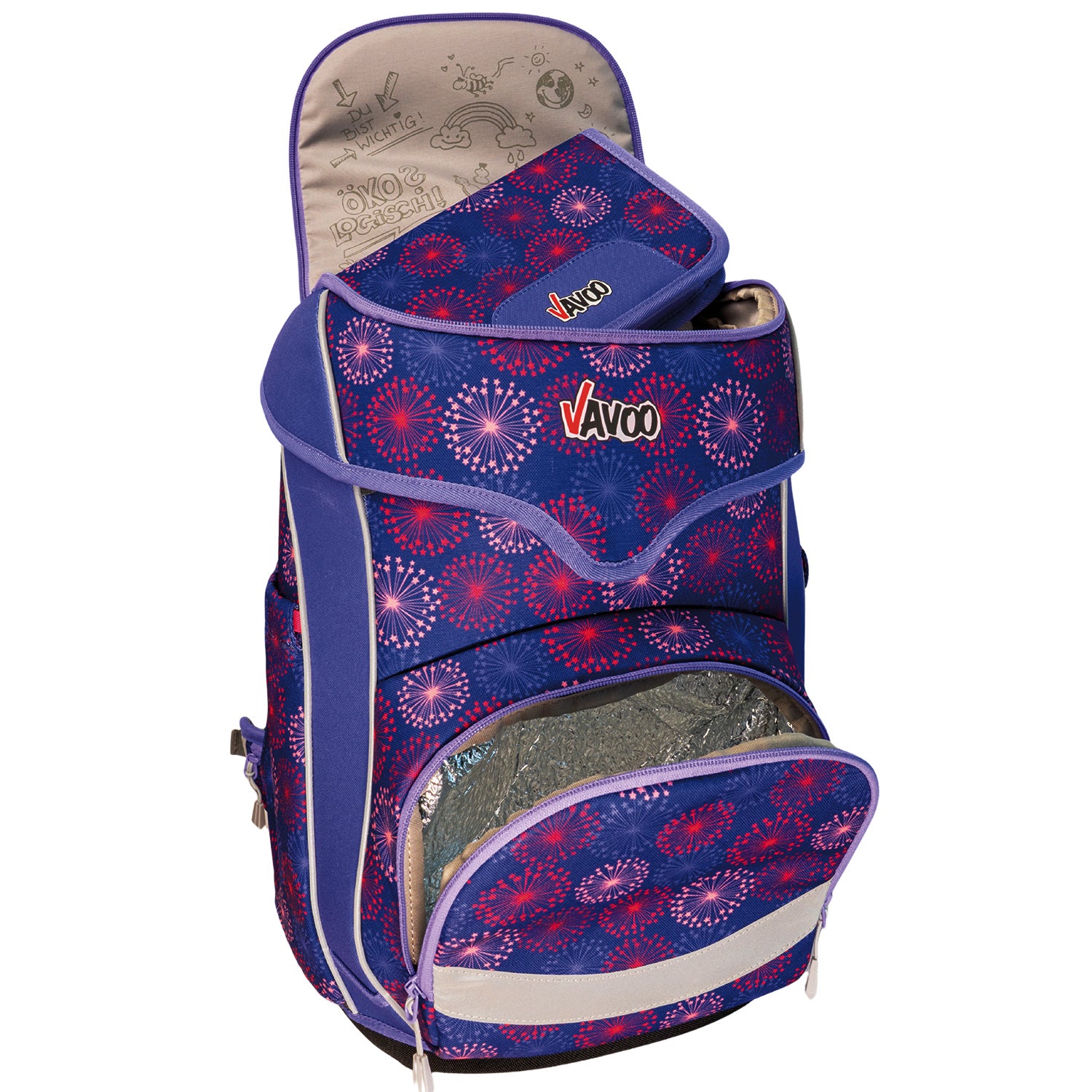 In der "frechen Klappe" (dem separaten Deckelfach mit Reißverschluss) befinden sich ein voll ausgestattetes Eberhart Faber-Federmäppchen und ein Stundenplan. Der Deckel ist durch die leicht bedienbare Schnapp-Magnetschnalle (Fidlock-Qualität) selbstschließend.